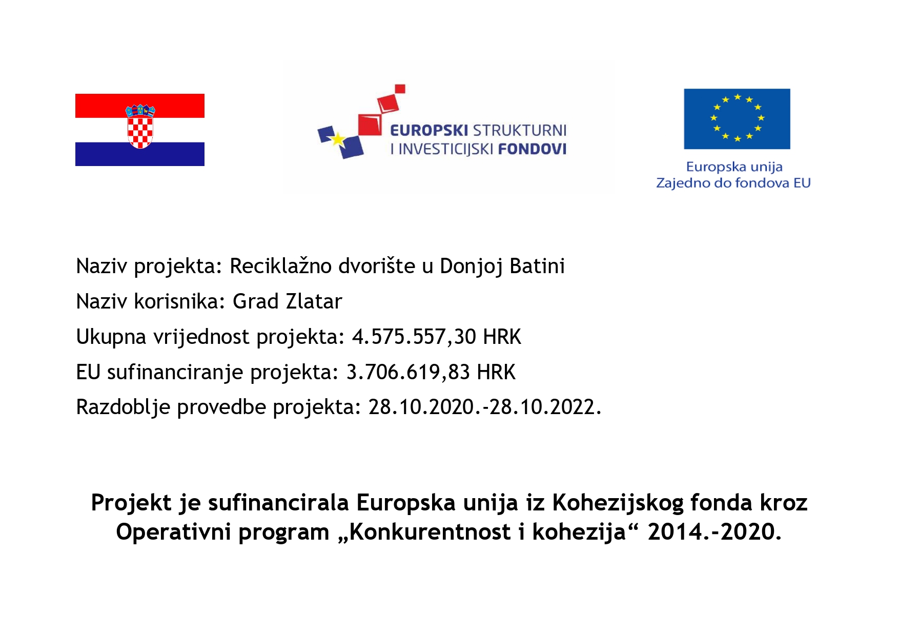 Grad Zlatar gradi reciklažno dvorište u svrhu sustavnog gospodarenja otpadom i zaštite okoliša. Izgradnjom reciklažnog dvorišta osigurat će se zasebno prikupljanje sirovina, obrada, korištenje otpada te smanjenje količine otpada odloženog na odlagalište. Cilj je unaprijediti gospodarenje otpadom, smanjiti količinu otpada, pridonijeti zaštiti okoliša te zaustaviti otvaranja novih divljih odlagališta. Projektom se želi riješiti problem otpada koji se može odlagati na kućnom pragu, poboljšati razdvajanje otpada i povećati iskoristivost otpada koji se može reciklirati. Provedba projekta doprinijet će smanjenju opasnog i neopasnog otpada koje se odlaže na odlagalištu te će tako doprinijeti sustavnom gospodarenju otpadom i ispuniti uvjete usklađivanja s europskim direktivama o otpadu. rnReciklažno dvorište u Donjoj Batini bit će na raspolaganju svim stanovnicima Zlatara. U sklopu projekta planira se postavljanje 19 kontejnera zatvorenog tipa volumena 7 m3, 3 eko kontejnera, 1 preša za kartonsku ambalažu, 2 kontejnera 1,5 m3, 3 klimatizirana natkrivena spremišta, 3 rolokontejnera, 32 m3 za glomazni otpad. Ukupna površina reciklažnog dvorišta je 3.600 m2, a nalazi se u naselju Donja Batina, uz županijsku cestu. rnOčekivani rezultati projekta su:rn- 1 izgrađeno reciklažno dvorište rn- Provedeno 6 informativno-edukativnih aktivnosti (javna tribina (1x), video film (1x), radio emisije (4x), edukativne bojanke (650 kom), brošure (2.000 kom) i letci (2.000 kom)). rn- Educirano i informirano 4.572 stanovnika Grada Zlatara rn- 35 tona ukupno odvojenog i prikupljenog otpada u godini nakon završetka projekta rn